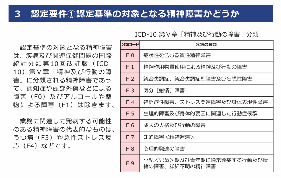 厚生労働省から「精神障害の労災認定」というパンフレットが発行されています。