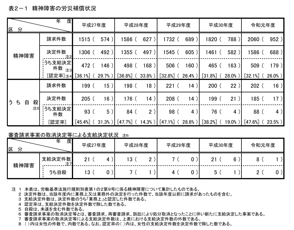 精神疾患による労災申請の認定率は下記の通りで約30%程度です。(出典:厚労省資料、原典からグラフと表の順番を入れ替えました)