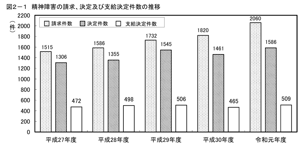 請求件数は毎年増えてますが、その増加に対して支給決定件数が増加していません。請求件数には未審査のものも含まれていますので正確なことは言えませんが、もっと支給決定件数が伸びててもよいと思います。